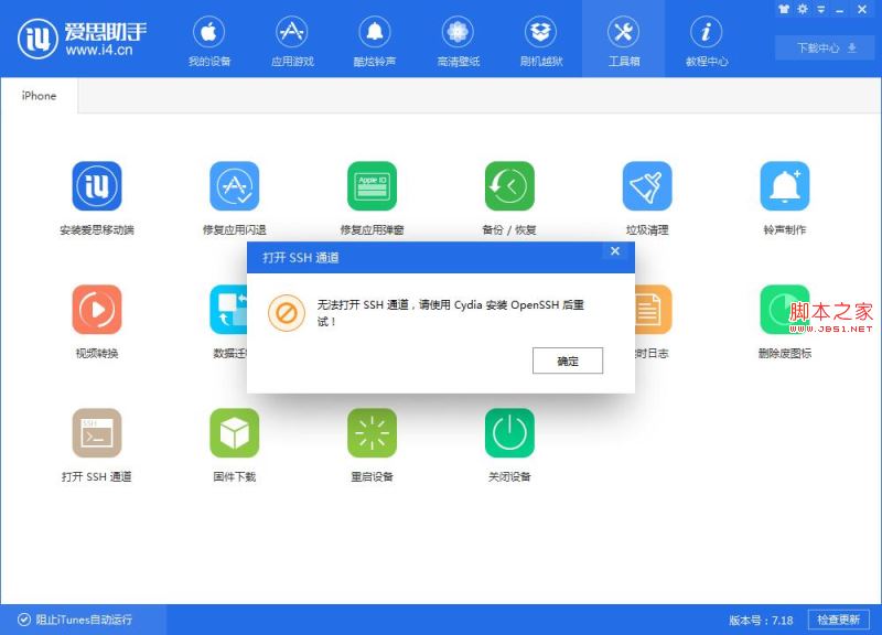2、点击“工具箱”→“OpenSSH”。如下图所示,“打开SSH通道”需要在Cydia中安装“OpenSSH”插件,请点击“确定”然后按以下步骤操作;