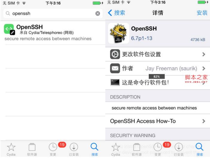3、在设备中打开“Cydia”,搜索“OpenSSH”,在搜索结果中选择“openSSH”并点击“安装”;