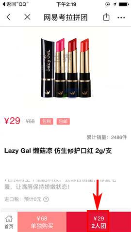 1)点开网易考拉海购APP,首先点击首页中的【拼团】,然后找到自己喜欢的商品后点击【去开团】;(如下图)