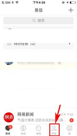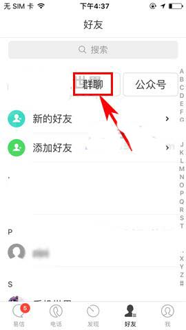 1)打开易信APP,首先点击首页下方的【好友】,随后选择【群聊】;(如下图)