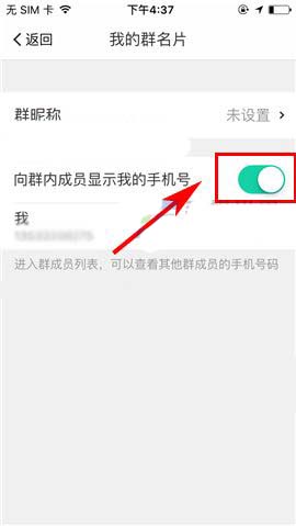 3)然后进入【我的群名片】,最后再开启【向群内成员显示我的手机号】功能就可以了!(如下图)