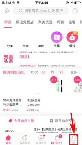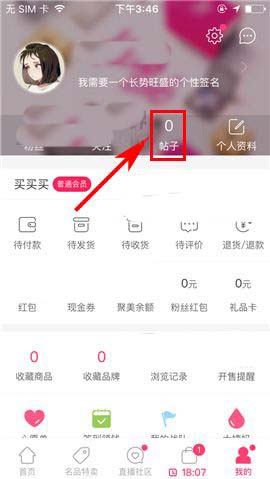1)点开手机聚美优品,首先点击首页右下角处的【我的】,然后点击界面中的【帖子】;(如下图)