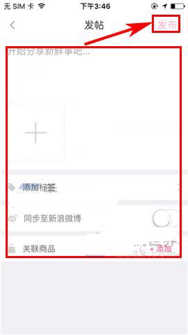 2)接着再点击屏幕中的【+】按钮,最后在编辑好相关内容后点击界面右上角处的【发布】就可完成啦。(如下图)