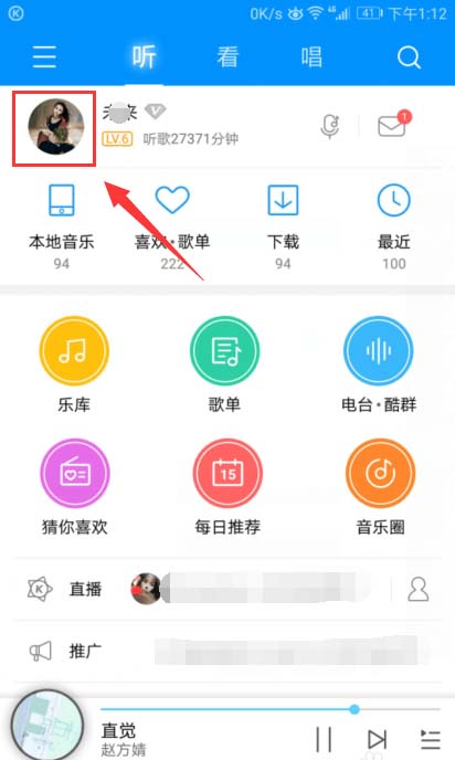2、来到了酷狗音乐,我们点击上方我们的头像,如图所示。