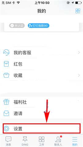 1)打开钉钉APP,首先点击首页右下角处的【我的】,然后上划界面进入【设置】;(如下图)
