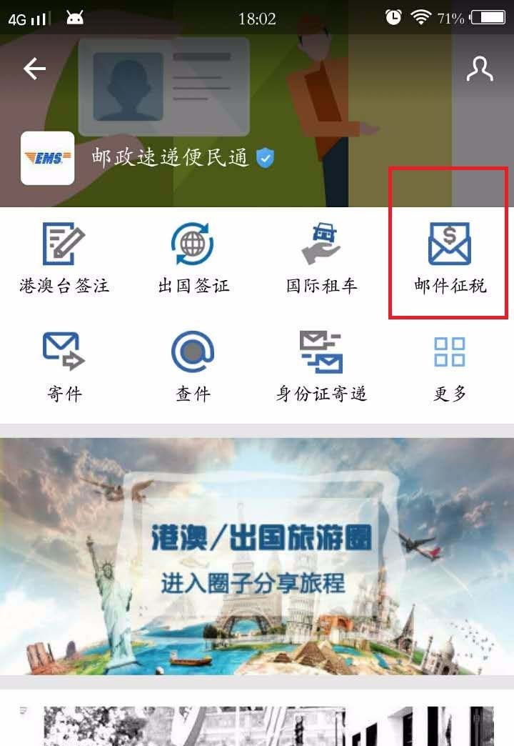 2、打开支付宝城市服务,找到进口邮件征税或者进入支付宝生活号邮政速递便民通,找到邮件缴税