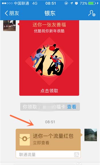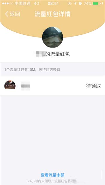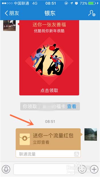 5、和发送红包的操作类似,对方会收到相应的收取流量的提示,相当于我们把流量塞进红包送给好友。