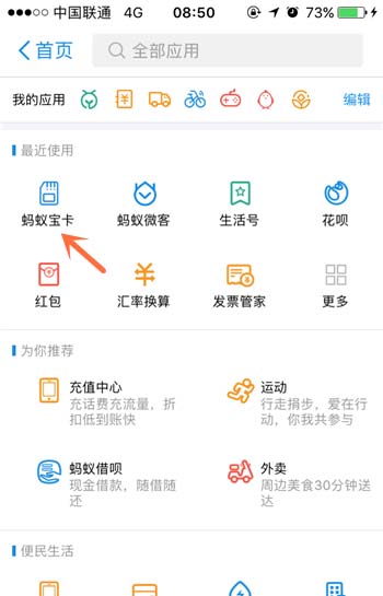1、如果大家是第一次使用蚂蚁宝卡,那么我们需要首先找到这个应用,具体查找方式我们可以在支付宝首页点击“全部应用”。