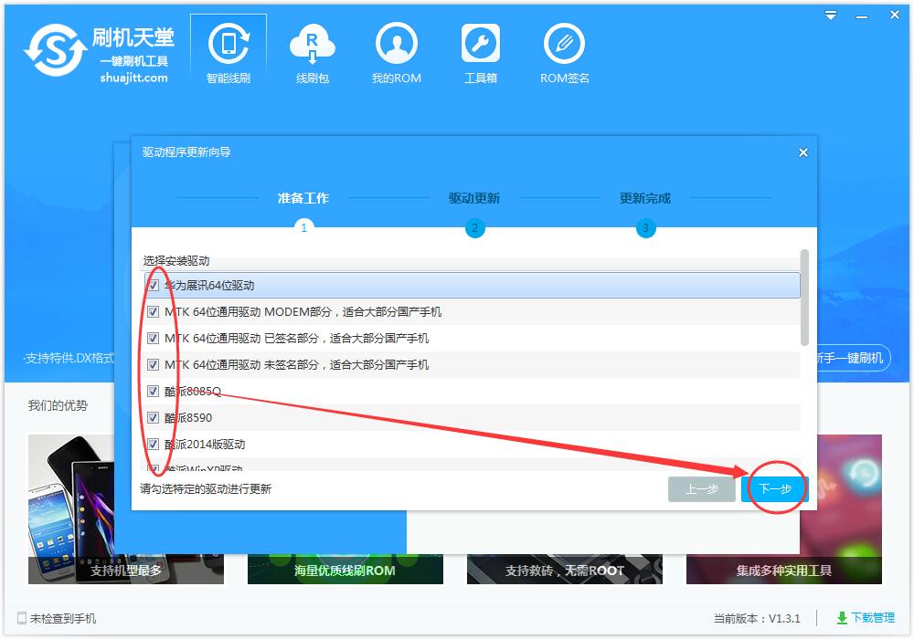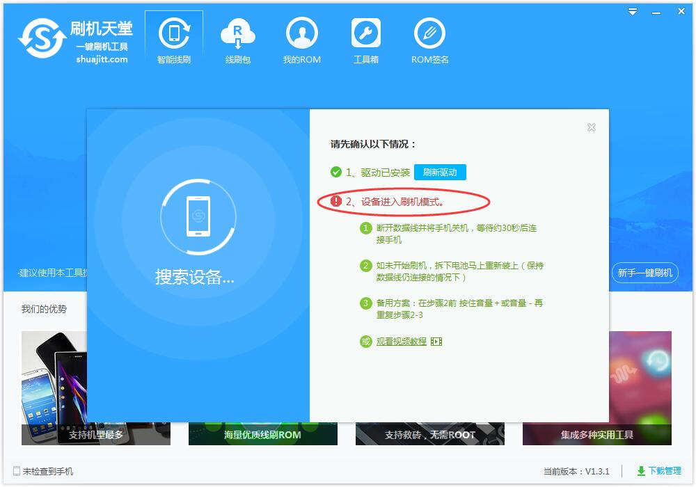 驱动安装完成后,按照提示,将手机数据线连接电脑进行刷机。