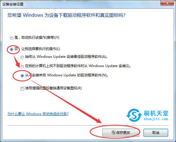 为设备下载驱动程序软件的时候,选择【否】--【从不安装来自 Windows Update的驱动程序软件】,然后保存更改。