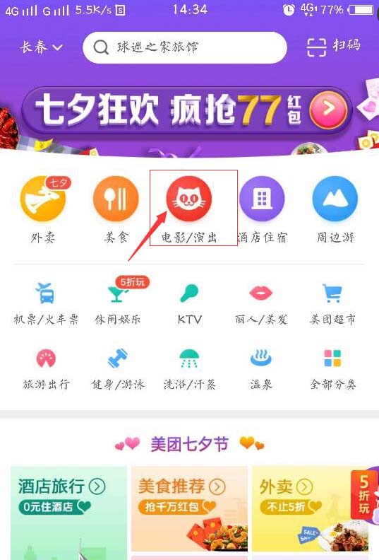 1、首先,在手机上打开美团。点击最中间的电影演出。