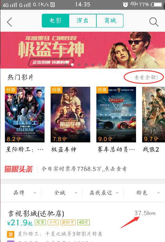 2、在这里你可以看到很多上映的热门影片。点击查看全部。