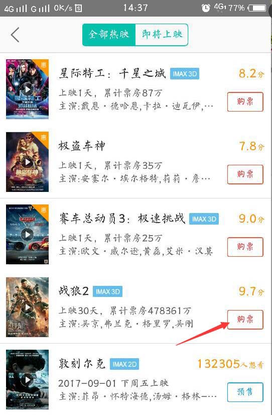 4、选择你要看的电影,点击购票。假如我选择了《战狼2》。