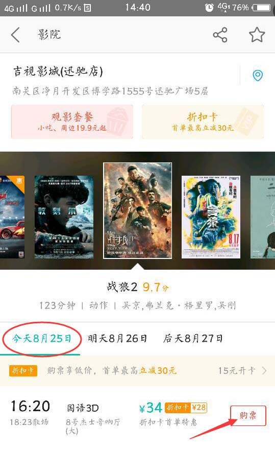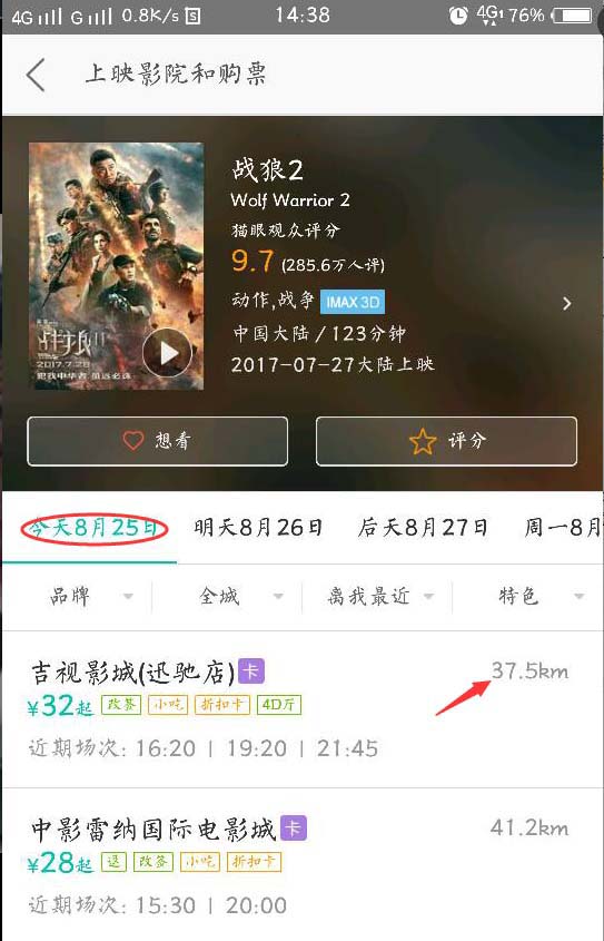 5、这时你可以看到,有哪些电影院在播放,时间和距离你的距离,以及电影院的设施情况。选择你要去的电影院,点击进入。选择你要在哪天买票,例如我选择了8月25日的票,点击购票。