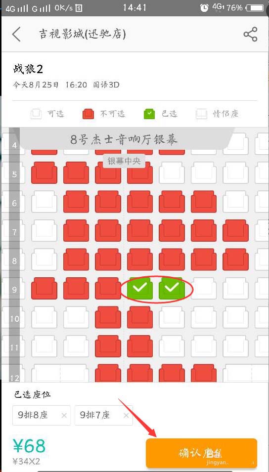6、进入选座,点击你要选择的座位。点击确认选座。
