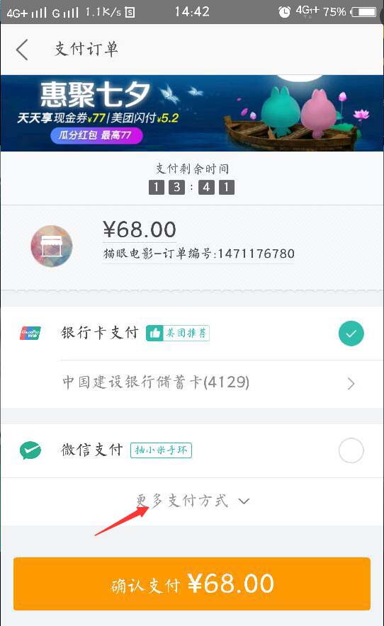 7、跳转至付款,点击确认支付,可以选择银行卡,微信,支付宝多种支付方式。支付后就购买成功了。购买成功后,再最下方的订单中,就可以查看到自己的订单情况了,到电影院,出示订单,就可以取票了。