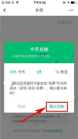 3)然后再点击【卡币换咚豆】,最后在考虑清楚及阅读完操作提示后点击【确认兑换】便可。(如下图)