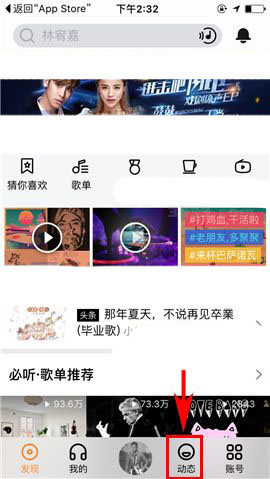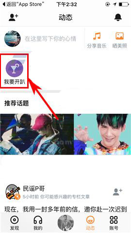 1)点开虾米音乐APP,首先进入“发现”中的【动态】页面,然后点击【我要开趴】;(如下图)