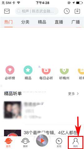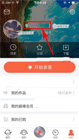 1)打开喜马拉雅FM,首先点击首页右下角处的【我的】,然后点击界面中的个人用户头像或是用户昵称;(如下图)