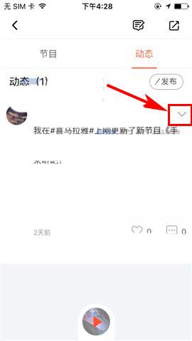 2)接着选择【动态】列表,随后再选择所要删除的动态,点击其右上角处的【下拉】图标;(如下图)