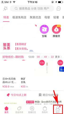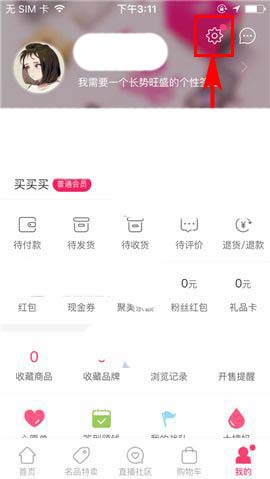 1)点开聚美优品APP,首先进入首页右下方的【我的】,接着点击界面上方的【设置】图标;(如下图)