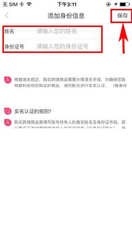 3)最后在输入姓名及身份证号后点击【保存】即可添加实名认证信息。(如下图)