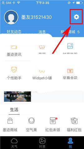1)打开墨迹天气APP,首先进入天气界面右下角的【我】,然后点击屏幕右上角处的【设置】图标;(如下图)