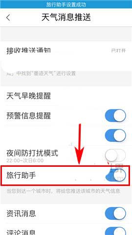 2)接着进入【天气消息推送】,最后再开启【旅行助手】即可。(如下图)