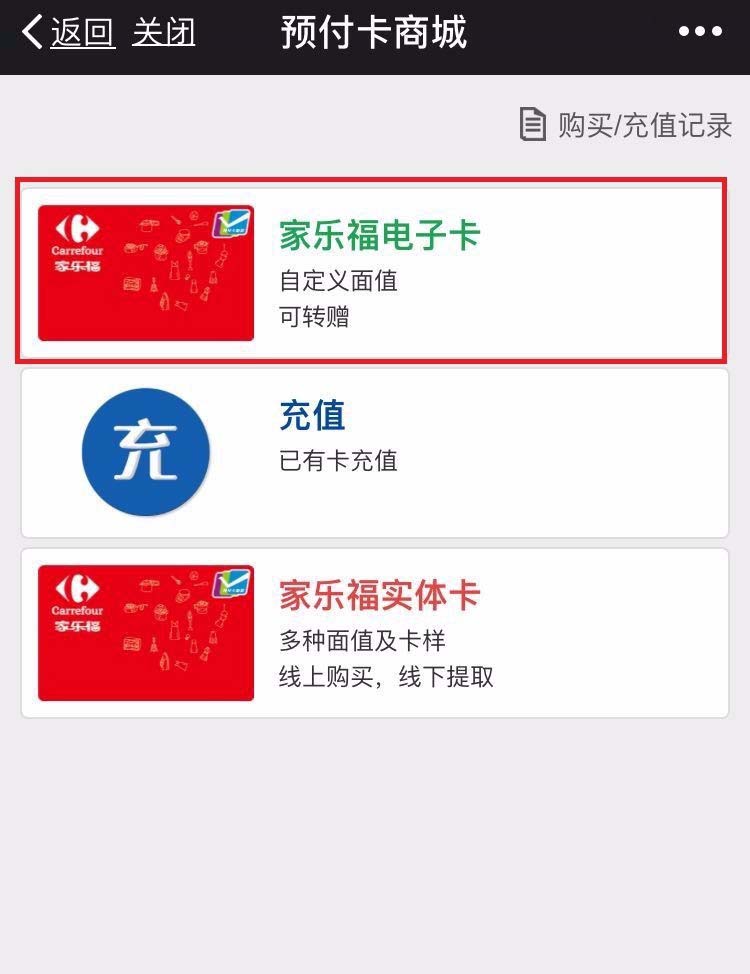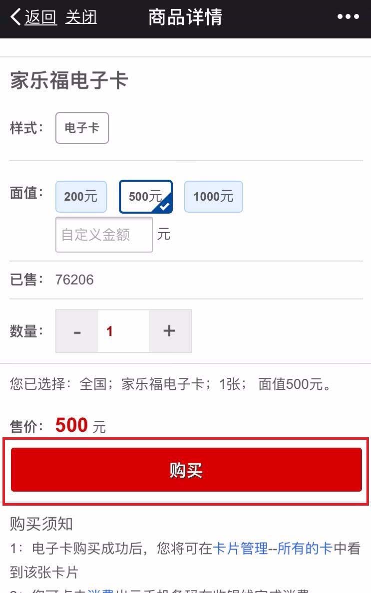 1、在微信中,点击“家乐福电子卡”,点击进入,选择合适的面值,点击下端的“购买”,获得卡券。