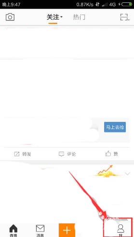 1、首先,打开手机上的新浪微博软件,登录微博账户。在页面底部的菜单栏右侧,点击【我】,进入用户中心,如图所示: