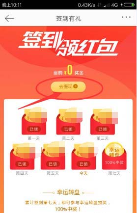 2、在用户中心页面,点击带有日历标志的【签到领红包】,如图所示: