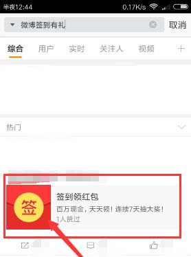 3、搜索微博签到好礼以后,将会搜到签到领红包的入口,点击这个签到链接,就可以完成签到领红包的任务。