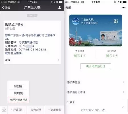 微信用户可关注“广东出入境”微信服务号,在左下角“办证指引”菜单栏中,选择电子港澳通行证,即可根据流程操作提示进行绑定。