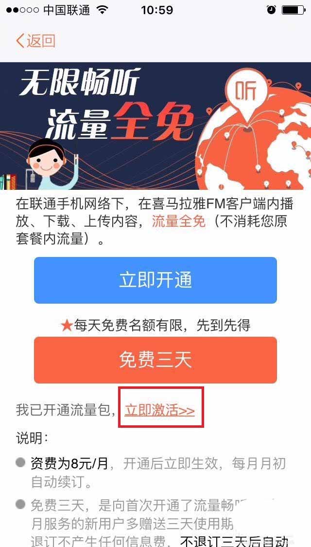 3、如果当前喜马拉雅账号没有跟你的包月服务手机号绑定,则需要进行激活。然后继续操作