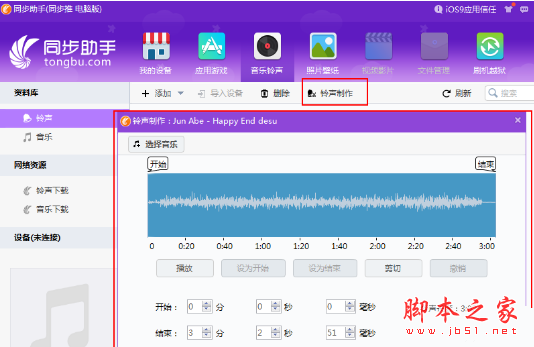 3、或者点击“铃声制作”,该功能还可以让我们自己剪辑音乐制作铃声,剪辑完毕后点击“导入设备”就可以了。如下图所示: