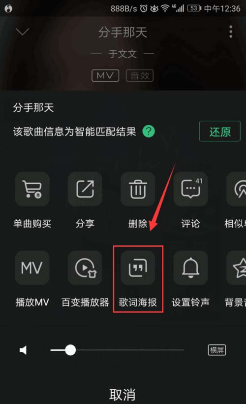 7、接着我们还可以进行歌词选择以及进行海报分享,如图。