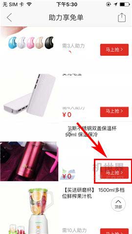 1)点开拼多多APP,首先点击首页中的【助力享免单】,然后滑动界面选择相关的商品,点击【马上抢】;(如下图)