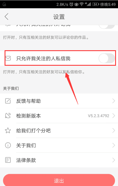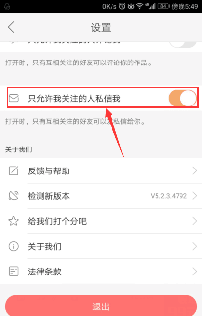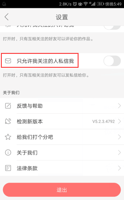5、在设置页面,我们下拉,可以看到只允许我关注的人私信我,系统默认是关闭的,如图。