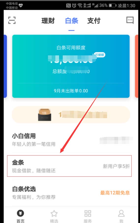 3、进入首页后,点击页面中部的“白条”选项,如下图箭头所示位置。