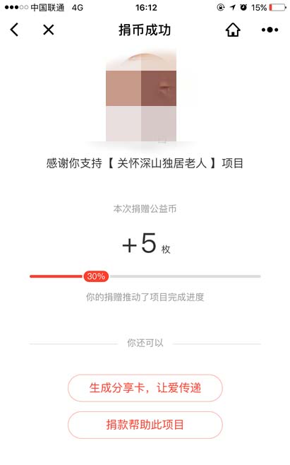 6、选择并确定了之后,你就捐赠成功了。你还可以点击生成分享卡。