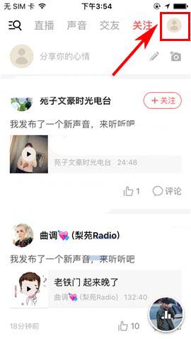 1)点开荔枝FM,首先点击首页右上角处的用户头像,然后进入【消息】;(如下图)