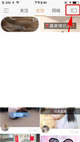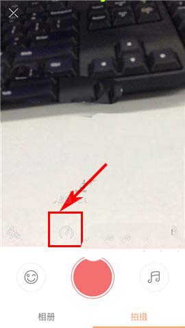 1)点开快手APP,首先点击首页右上角处的【拍摄】图标,接着点击界面中箭头所指的【速率】图标;(如下图)