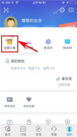 1)打开携程旅行APP,首先进入首页右下角处的【我的】,然后点击【全部订单】;(如下图)