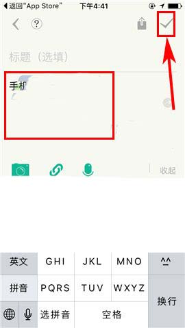 点开盯盯APP,首先点击首页中箭头所指处的【新建记事】,接着在界面中编辑相关的备忘录内容,点击右上角处的【对勾】符号即可。(如下图)
