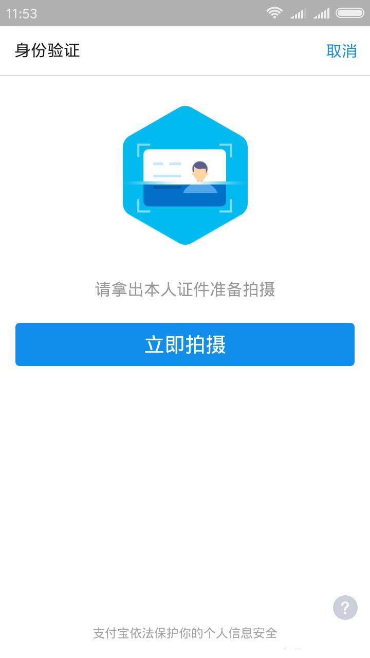 4、点击立即拍摄,把身份证正面平铺到亮堂的地方,取景区域和身份证重叠上,稳住手机,系统会自动扫描识别。