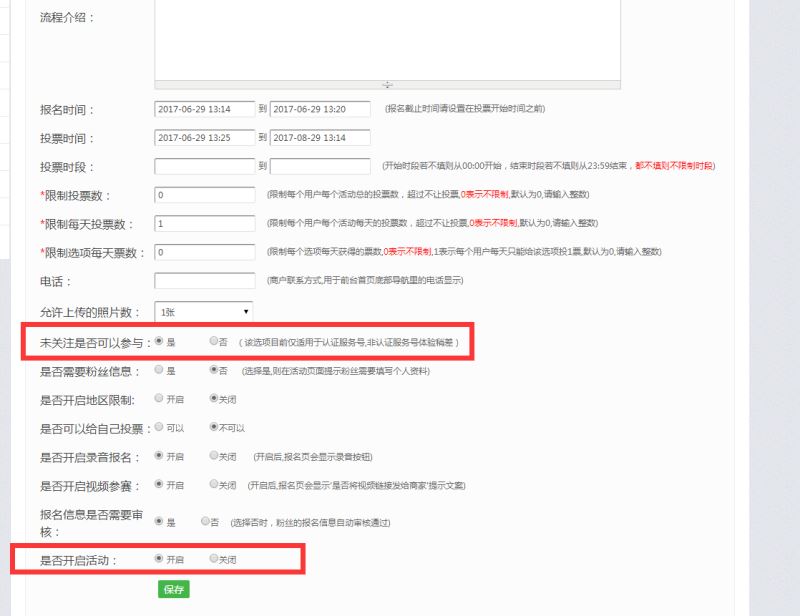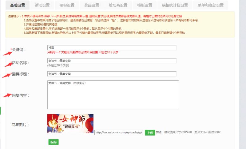 第三步:活动正式创建,点击图文投票---新增图文投票,对活动添内容进行编辑,只能写一个关键词,功能面板必须开启投票,填好保存下一步,活动设置里面填写好活动简介规则等,这里特别说一下,报名时间请设置在投票开始前.