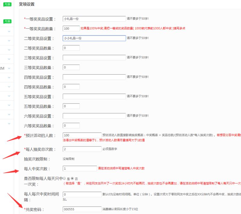 第四步:奖项设置,可根据自己的需求设置,但是不能超过6个奖项,可以根据自己活动的情况,计算活动概率,概率是整个活动的概率。中奖概率 = 奖品总数/(预估活动人数*每人抽奖次数) ,抽奖次数限制可以设置没有限制、每日限制、分享限制,设置好之后是不可以修改的.