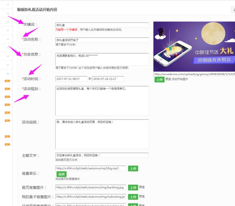 第三步:点开微活动,可以看到抽奖类的功能有多个,如大转盘、摇一摇、拆礼盒等,这里我们以拆礼盒为大家具体介绍,点击新增活动,依次填写活动的关键词、时间、规则等信息,可以添加主题文字和背景音乐等,最后填写活动结束时的主题内容.
