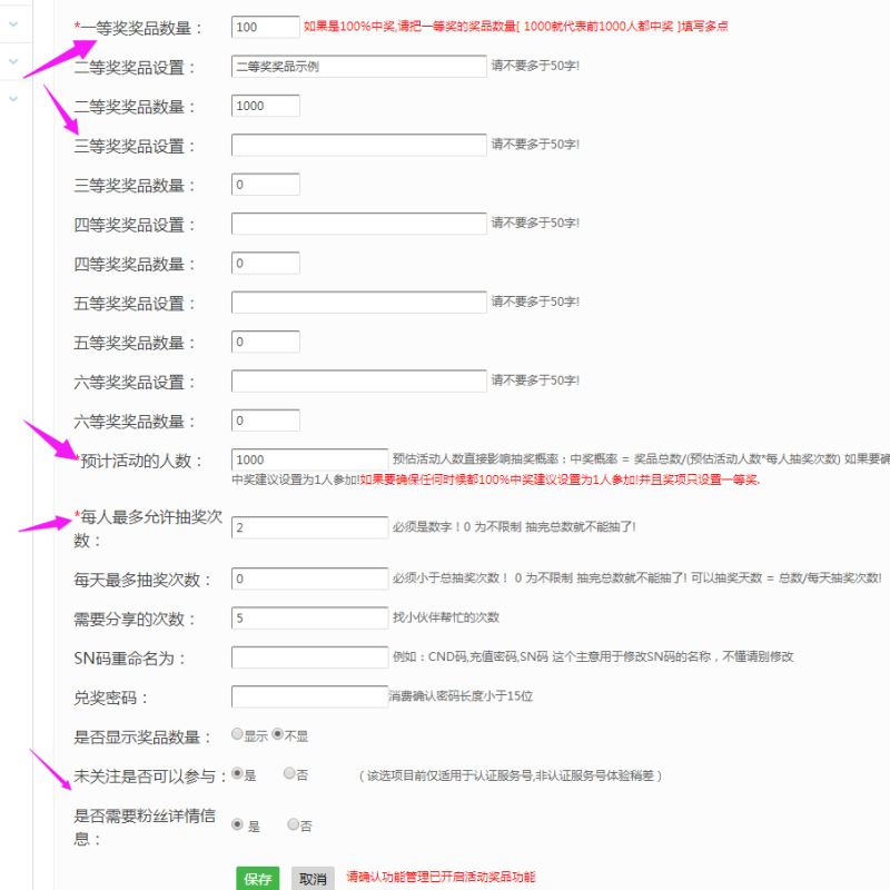 第四步:奖项设置里最多可以添加六个,下面是预计活动的人数和每人最多允许抽奖次数。可以设置需要分享的次数,选择未关注是否可以参与,最后点击保存。完成以上步骤,微信公众号添加抽奖功能就完成了.
