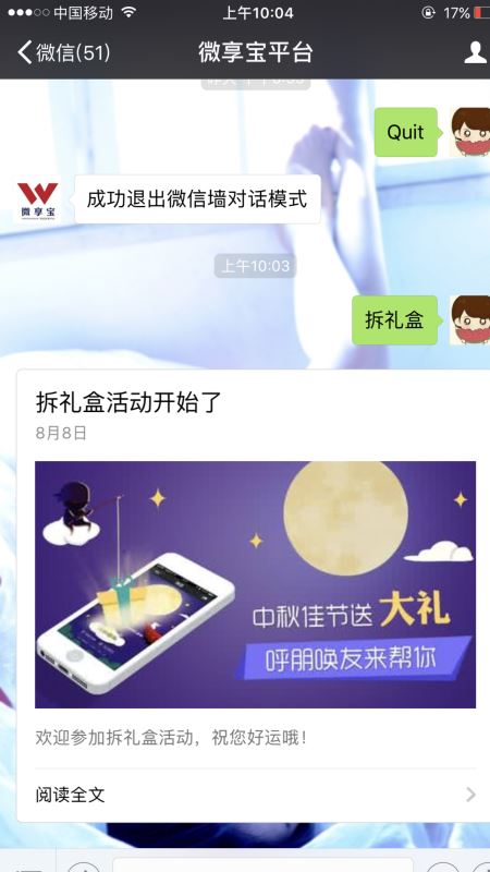 第五步:回到公众号,向公众号发送关键词即可弹出我们刚做的活动,也可以将此活动的链接添加到阅读原文或自定义菜单中。回到制作后台,里面有参与记录和用于兑奖用的SN码管理